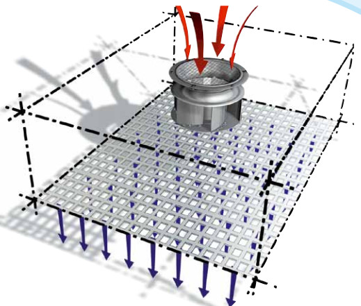 Quạt gió trong FFU sẽ hút luồng khí qua nó, đồng thời đẩy dòng khí xuống phía dưới, quá trình này đưa các dòng khí đi qua các màng lọc. Không khí sạch sẽ được cấp xuống dưới.