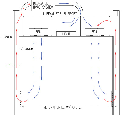 Thông thường, người ta sẽ lắp đặt thêm 1 hệ thống hút ở phía dưới khu vực treo FFU nhằm tuần hoàn liên tục để việc cấp khí sạch diễn ra theo 1 chu trình.